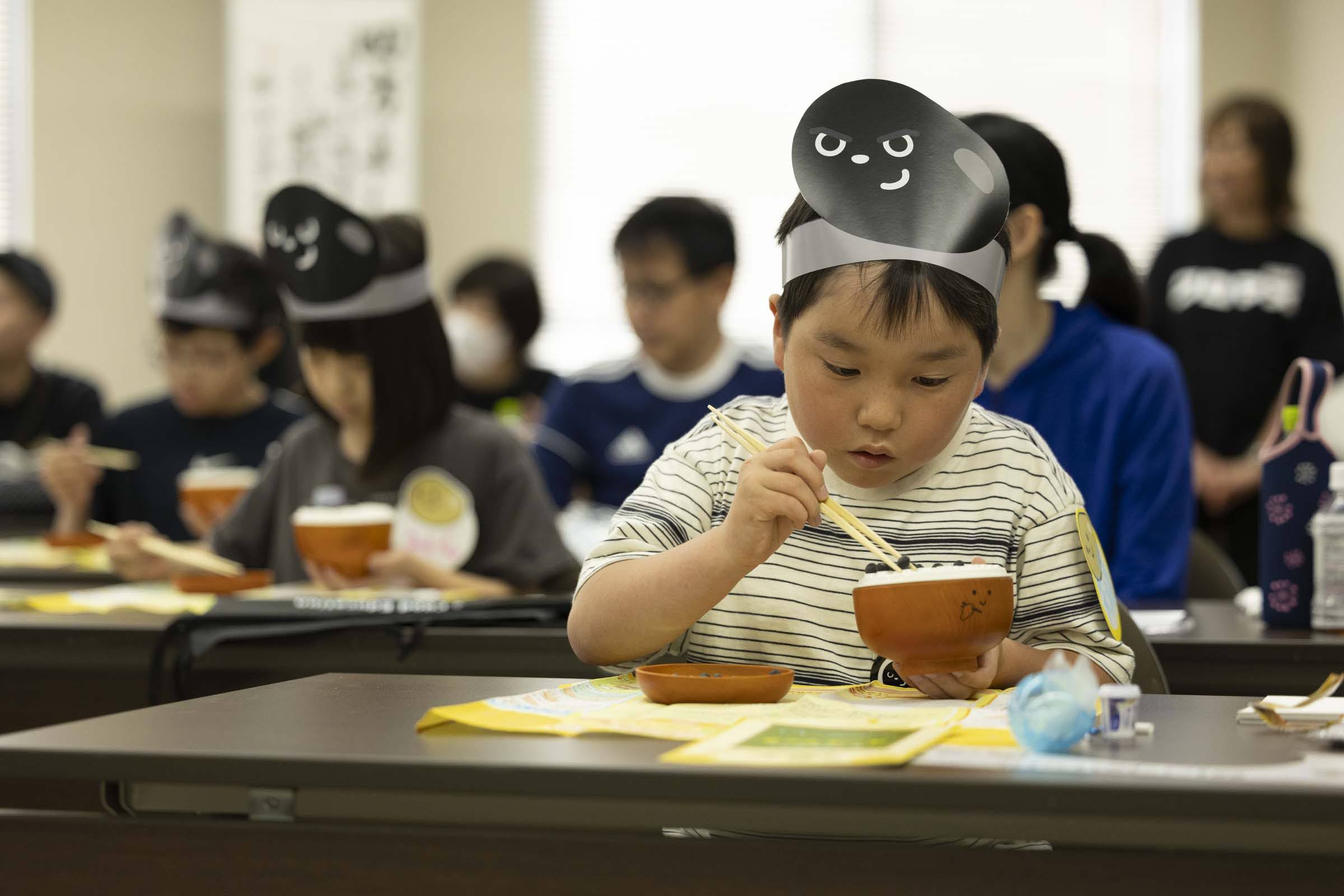 正しいお箸の使い方を学びましょう!利き手にお箸、逆手に「まめっ子くん」のお椀を持ち、ふたに入れた大豆を1分間に何粒お椀の穴に載せることが出来るかを競います。