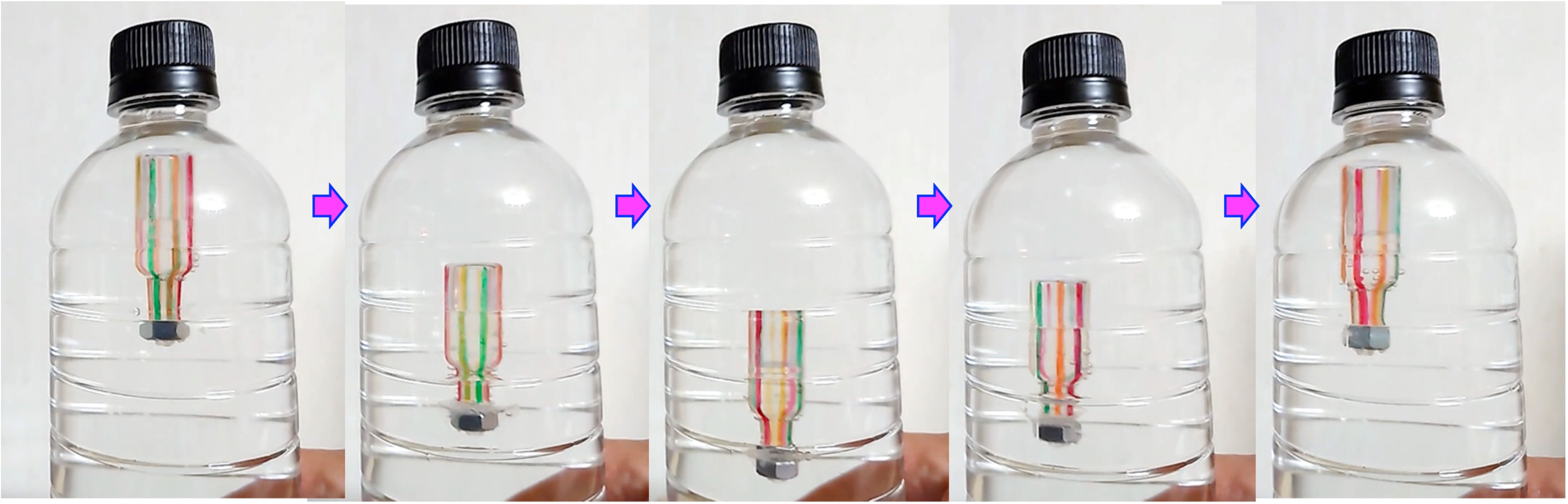 ペットボトルの中で魚の形のしょうゆ入れを浮き沈みさせ,魚釣りゲームをして遊びましょう。また、回転するタイプも作ります。