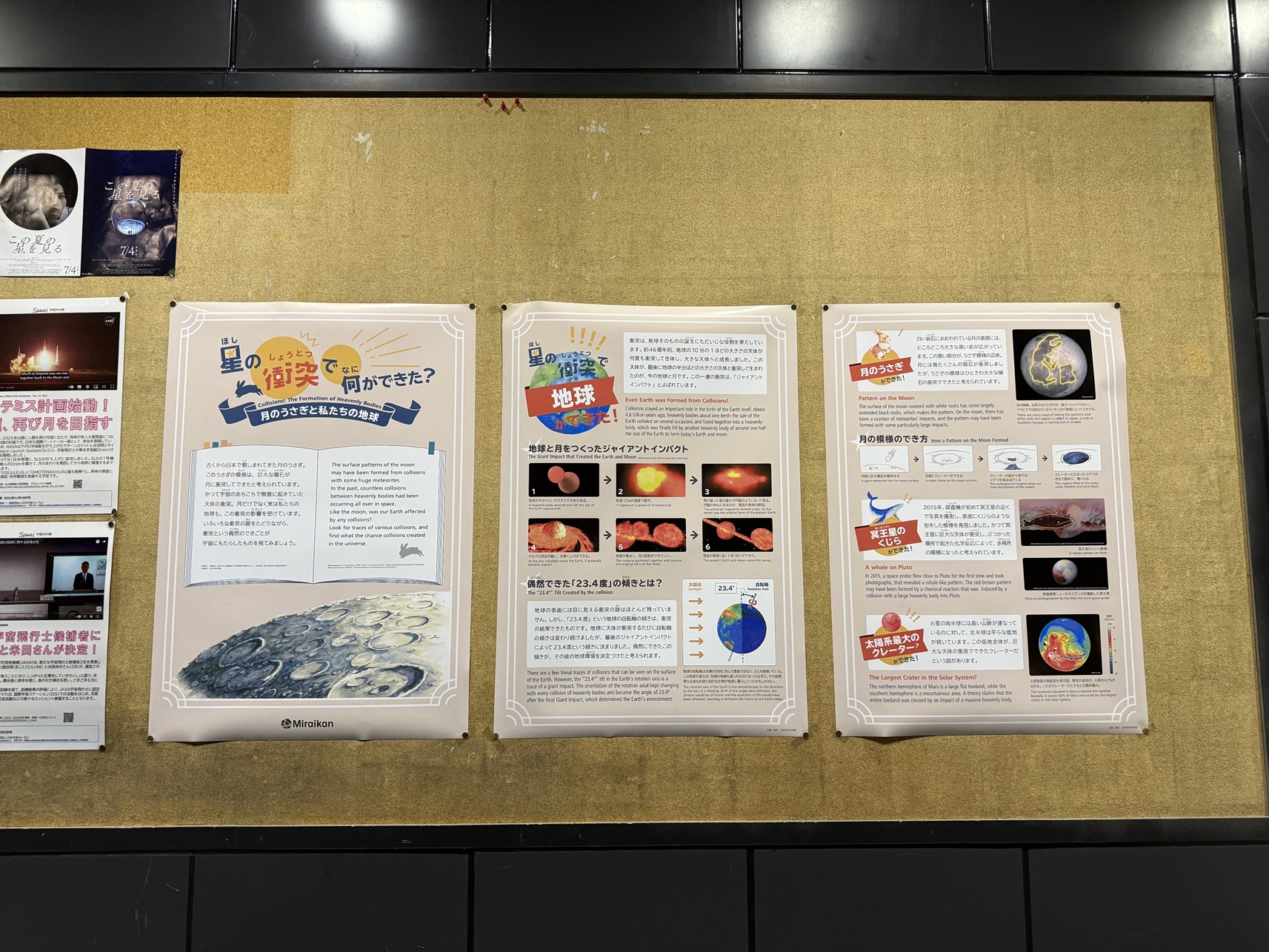 日本で昔から親しまれてきた月のうさぎ模様。遠く離れた冥王星にも「くじら」のような模様が見つかっています。これらは、約40億年前に天体が衝突した跡ではないかと考えられています。では、私たちの暮らす地球にも、このような衝突の影響は残っているのでしょうか? かつて太陽系で頻発していた天体衝突という偶然の出来事が、月のうさぎだけでなく地球の誕生にまで関わり、今の地球環境を決定づけていたことを学ぶパネル展示です。