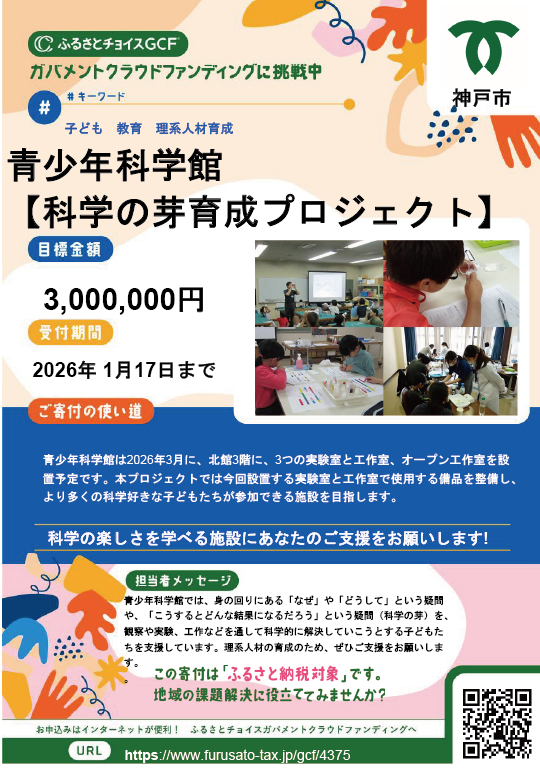 バンドー神戸青少年科学館は2026年3月に、北館3階に3つの実験室と工作室、オープン工作室を設置予定です。本プロジェクトでは今回設置する実験室と工作室で使用する備品を整備し、より多くの科学好きな子どもたちが参加できる施設を目指します。