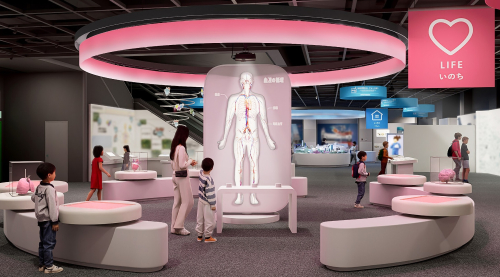 巨大な人体模型をもとに、体の全体像と、体の中で起きている循環や消化などの流れを展示。